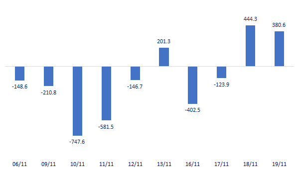 - Ngày 18/11, HNX tổ chức phiên đấu thầu trái phiếu Chính phủ (TPCP) do Kho bạc Nhà nước phát hành với tổng khối lượng gọi thầu 6.000 tỷ đồng tại các kỳ hạn 7, 10, 15 và 20 năm. Kết quả, phiên đấu thầu đã huy động được 4.400 tỷ đồng, lãi suất tăng tại kỳ hạn 15 và 20 năm.
