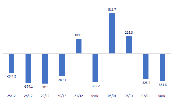 - Phiên giao dịch ngày 8/1, khối ngoại tiếp tục bán ròng với tổng giá trị bán ròng 351 tỷ đồng. Trong đó, lực bán tập trung vào HPG với giá trị 305,08 tỷ đồng, SSI 74,92 tỷ đồng, DXG (8,51 tỷ đồng) VIC 45,93 tỷ đồng, VND 37,7 tỷ đồng…