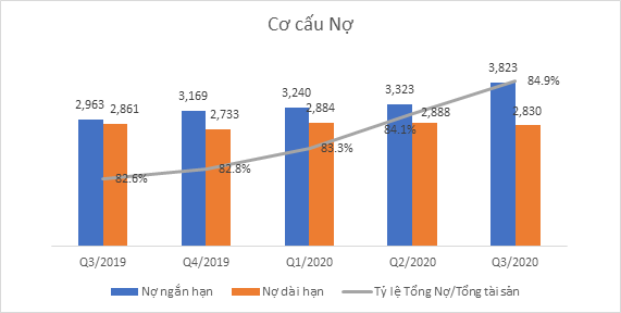 Cơ cấu nợ của C4G có xu hướng tăng dần trong các Quý gần đây và ghi nhận 6.654 tỷ đồng vào thời điểm 30/09/2020 (tăng 752 tỷ đồng so với cùng kỳ năm 2019). Theo đó, Tỷ lệ Nợ/Tổng Tài sản chiếm 84,86%, trong đó Nợ vay ngân hàng/Tổng tài sản là 49,8% và đạt gần 3.907 tỷ đồng, theo đó sẽ gây áp lực trả nợ cho công ty trong thời gian tới.