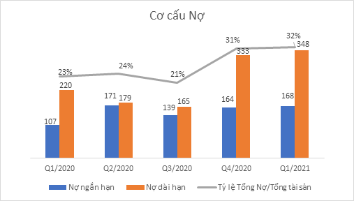 Tỷ lệ Nợ/Tổng tài sản của VIP tăng trên 30% trong 2 quý gần đây, do công ty vay thêm 188 tỷ đồng mua tàu Petrolimex 21. Tại thời điểm 31/03/2021, Tổng Nợ phải trả của VIT đạt 516 tỷ đồng với đa số là Nợ dài hạn chiếm 67,4%. Tỷ lệ Nợ vay ngân hàng/Tổng tài sản đang chiếm khoảng 20,4%, khá thấp so với các doanh nghiệp cùng ngành.