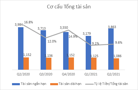 Về cơ cấu Tài sản ngắn hạn, tỷ trọng Hàng tồn kho và Các khoản phải thu ngắn hạn chiếm lần lượt 27,7% và 38,2% tương ứng 1.069 tỷ đồng và 1.476 tỷ đồng. Các khoản phải thu cho thấy sự tăng trưởng mạnh nhất khi tăng đến 13% so với hồi đầu năm, trong đó Phải thu khách hàng tăng thêm đến 187 tỷ đồng lên 1.694 tỷ đồng, Trả trước người bán ghi nhận 29,5 tỷ đồng (tăng 5 tỷ đồng), Phải thu khác 23,3 tỷ đồng (tăng 8 tỷ đồng do tăng các khoản Tạm ứng).
