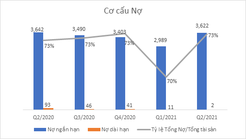 Tỷ lệ Nợ/Tổng tài sản của PLC có dấu hiệu tăng trở lại vào Quý 2.2021 và đạt 73%. Về cơ cấu Nợ của công ty đa phần là Nợ ngắn hạn, trong đó nhiều nhất là khoản Phải trả người bán 1.901 tỷ đồng (tăng 39,2% so với đầu năm), Vay ngân hàng ngắn hạn 1.565 tỷ đồng (giảm 15,2%, tương ứng hơn 280 tỷ đồng)