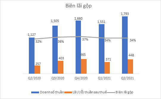 VCS ghi nhận doanh thu thuần quý 2/2021 đạt 1.793 tỷ đồng, tăng 59% so cùng kỳ. Lãi gộp tăng 69%, đạt 606 tỷ đồng. Doanh thu tài chính trong kỳ tăng 116% lên mức 15.4 tỷ đồng, chủ yếu do lãi tiền gửi, tiền cho vay tăng 1.6 tỷ đồng và lãi chênh lệch tỷ giá tăng 6.7 tỷ đồng.