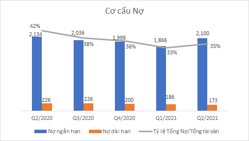 Kết thúc Quý 2/2021, công ty ghi nhận Tổng nợ phải trả 2.273 tỷ đồng, theo đó, tỷ lệ Nợ/Tổng tài sản của VCS chiếm 35%. Các khoản nợ của công ty hầu hết là Nợ ngắn hạn, theo đó, trong năm nay công ty sẽ phải trả 2.100 tỷ đồng, trong đó gần 1.537 tỷ đồng là khoản vay ngân hàng ngắn hạn.