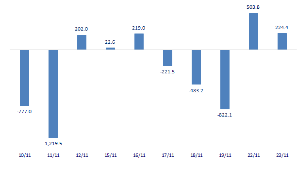 - Khối ngoại tiếp tục là điểm sáng trong phiên hôm nay khi vẫn duy trì mua ròng 224 tỷ đồng trên cả 3 sàn chứng khoán. Các cổ phiếu VHM, MSN, FUESSVFL hôm nay ghi nhận giao dịch khối ngoại tích cực khi được mua ròng hàng chục tỷ đồng. Trong khi đó ở chiều ngược lại, SSI và VPB là hai cổ phiếu bị khối ngoại bán ròng trên trăm tỷ