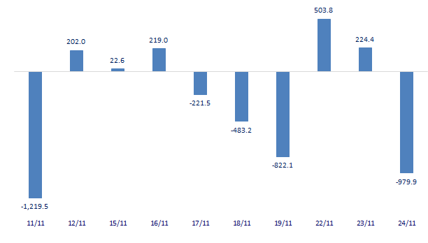 - Các thị trường chứng khoán châu Á – Thái Bình Dương trái chiều trong phiên 24/11. Chỉ số MSCI châu Á – Thái Bình Dương không gồm Nhật Bản tăng 0,07%. Tại Nhật Bản, Nikkei 225 giảm 0,85% còn Topix giảm 1,16%. Thị trường Trung Quốc trái chiều với Shanghai Composite tăng 0,1% còn Shenzhen Component giảm 0,118%. Hang Seng của Hong Kong tăng 0,19%. Chỉ số Kospi của Hàn Quốc giảm 0,1%