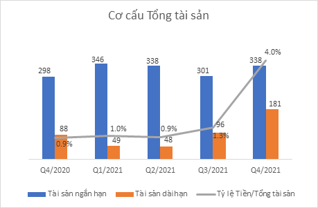 Tính đến 31/12/2021, tổng tài sản đạt 519 tỷ đồng, tăng 34,4% so với đầu năm. Các khoản phải thu ngắn hạn chiếm 43%, tương đương gần 225 tỷ đồng. Trong đó khoản phải thu khác tăng từ hơn 8,5 tỷ đồng đồng lên gần 107 tỷ đồng, đây là các khoản phải thu về mua cổ phần CTCP Hưng Đại Việt.