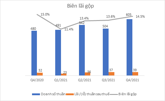 Lũy kế cả năm 2021, tổng doanh thu đạt 2.142 tỷ đồng, tăng 12,7% so với năm 2020, trong khi đó tỷ lệ tăng chi phí vốn là 14,1% dẫn đến lợi nhuận gộp còn 285 tỷ đồng, tăng 4,9% so với cùng kỳ. Biên lợi nhuận gộp đạt 13,3%.