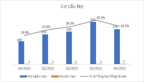 Tính đến thời điểm cuối năm 2021, Hàng tồn kho tăng khá mạnh so với cùng kỳ khi tăng hơn 22,5% với chủ yếu là Nguyên liệu, vật liệu, tăng 106 tỷ đồng. Hàng mua đang đi trên đường và Thành phầm cũng ghi nhận tăng lần lượt 20 tỷ và 10,5 tỷ so với cùng kỳ.