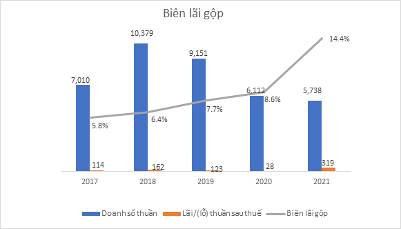 Luỹ kế cả năm 2021, doanh thu thuần đạt 5.738 tỷ đồng giảm 6% so với cùng kỳ. Nhờ tiết kiệm chi phí nên LNST đạt 318 tỷ đồng tăng mạnh so với con số hơn 28 tỷ đồng của năm 2020. EPS năm 2021 đạt 2.360 đồng.
