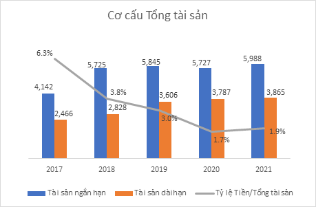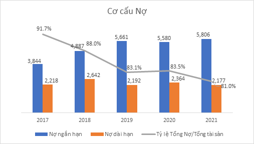 Tuy nhiên, trong cơ cấu tài sản ngắn hạn, Hàng tồn kho lại chiếm tỷ trọng lớn nhất với 85% và ghi nhận giá trị 5.102 tỷ đồng. So với thời điểm cuối năm 2020, Hàng tồn kho chỉ tăng khoảng 88 tỷ đồng (tương ứng gần 1,8%) và hiện đang chiếm 51,8% trong cơ cấu Tổng tài sản. Trong đó, Hàng tồn kho chủ yếu là Hàng hóa 3.090 tỷ đồng và Thành phẩm 1.833 tỷ đồng.