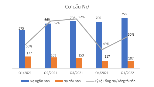 Tại thời điểm 31/03/2022, Tổng Nợ phải trả của Nafoods ghi nhận 861 tỷ đồng với đa số là Nợ ngắn hạn chiếm 87,5%. Tỷ lệ Nợ vay ngân hàng/Tổng tài sản đang chiếm khoảng 34,7%. Trong năm nay, công ty sẽ cần thanh toán đến 486 tỷ đồng vay ngắn hạn ngân hàng.