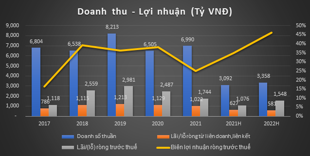 Về tài sản dài hạn có thể thấy được xu hướng ngày càng tăng qua các năm, đến thời điểm giữa năm 2022 đạt mức gần 20,000 tỷ chủ yếu đến từ những khoản đầu tư mạnh vào các công ty liên doanh liên kết của BCM.