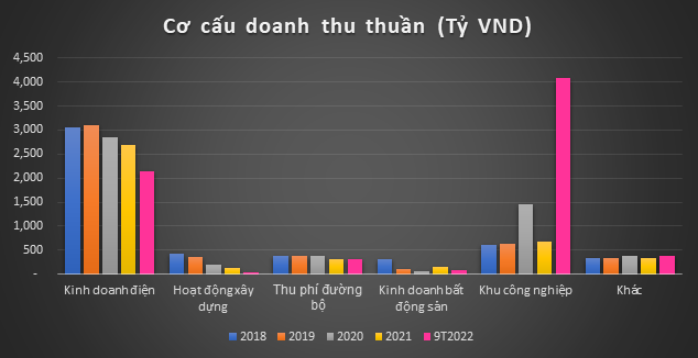Tuy nhiên, kể từ khi thay đổi chính sách ghi nhận doanh thu 1 lần, cơ cấu doanh thu của IDC đã có sự thay đổi. Cụ thể là doanh thu BĐS KCN chiếm phần lớn khi chiếm khoảng 58% tổng doanh thu thuần, xếp sau là doanh thu từ mảng điện khi chiếm 30%. Các mảng còn lại như thu phí cầu đường, xây dựng, kinh doanh BĐS dân cư hay các dịch vụ khác chiếm tỷ trọng không đáng kể.