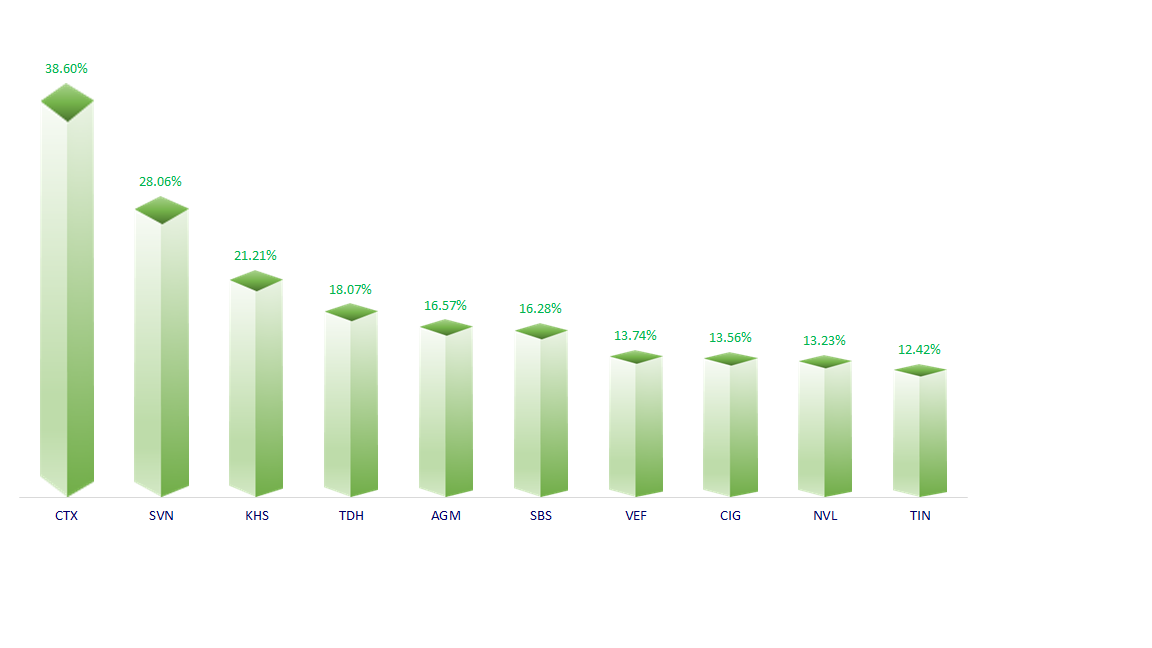 Một số cổ phiếu tăng điểm đáng chú ý khác như NVL +3.4%, MSN +1%, BMP và PTB đều +0.8%,…