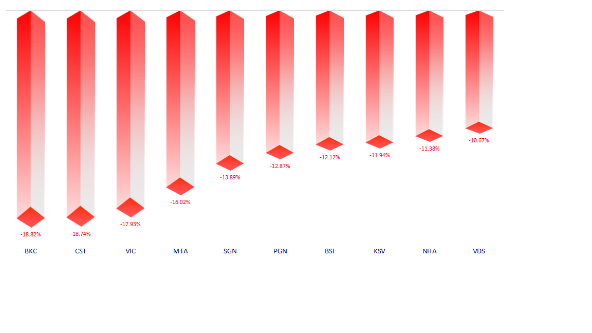 Một số cổ phiếu giảm điểm đáng chú ý khác như Công nghệ (CMG -2.8%, SGT -2.5%, ELC -1%), Viễn Thông (TNN -5.8%, CTR -5.4%, VGI -3.2%), Hóa Chất (CSV -4.2%, DPM -3%, DDV -2%), Xây dựng và Vật liệu (HUT -7.6%, VCS -5.2%, IJC -3.9%,…), SGN sàn.