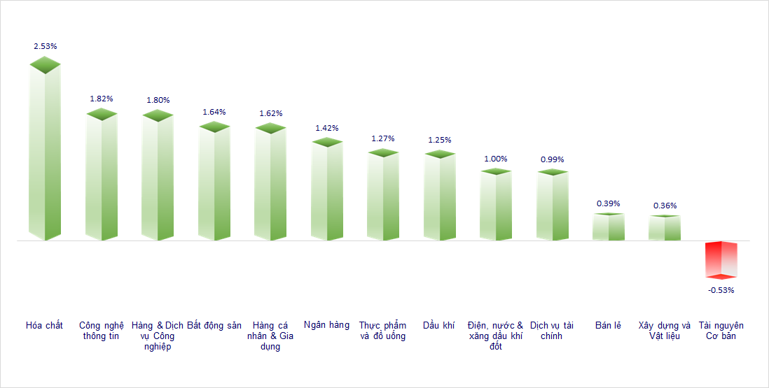 VN-Index bùng nổ theo đà trong ngày Trung Quốc và Mỹ cùng giảm 115% mức thuế quan áp lẫn nhau. Đa số các nhóm ngành hôm nay đều tăng điểm tích cực. Chỉ trừ duy nhất nhóm Tài nguyên diễn biến khá ảm đạm.