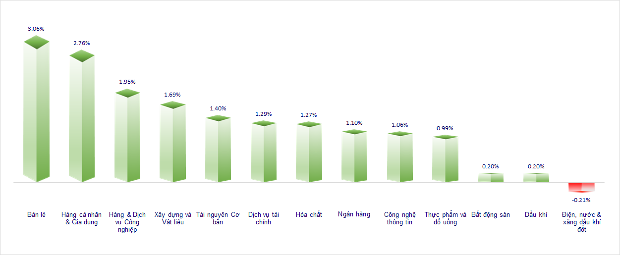 VN-Index tiếp đà tăng điểm với thanh khoản tỷ đô, khối ngoại mua ròng mạnh nhất trong tháng qua. Hầu hết các nhóm ngành đều tăng điểm trong phiên hôm nay, đáng chú ý nhất là nhóm Dịch vụ bán lẻ và nhóm Hàng hóa và dịch vụ công nghiệp.