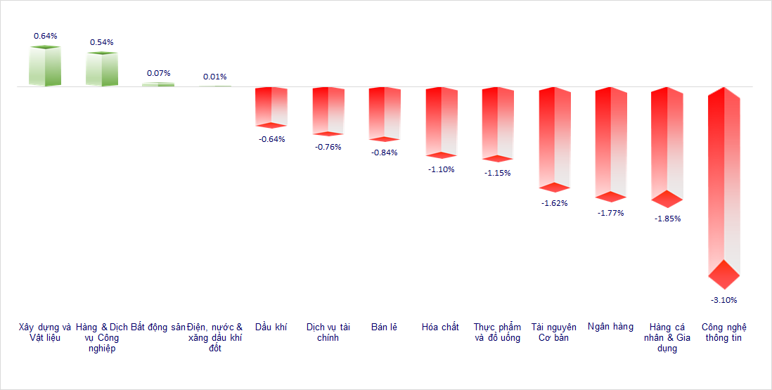 Hầu như toàn bộ nhóm ngành đều giảm điểm trong phiên hôm nay, trong đó tiêu cực nhất là nhóm công nghệ, ngân hàng và tài nguyên cơ bản. Trái lại, BĐS và điện là những nhóm hiếm hoi ngược dòng tăng điểm