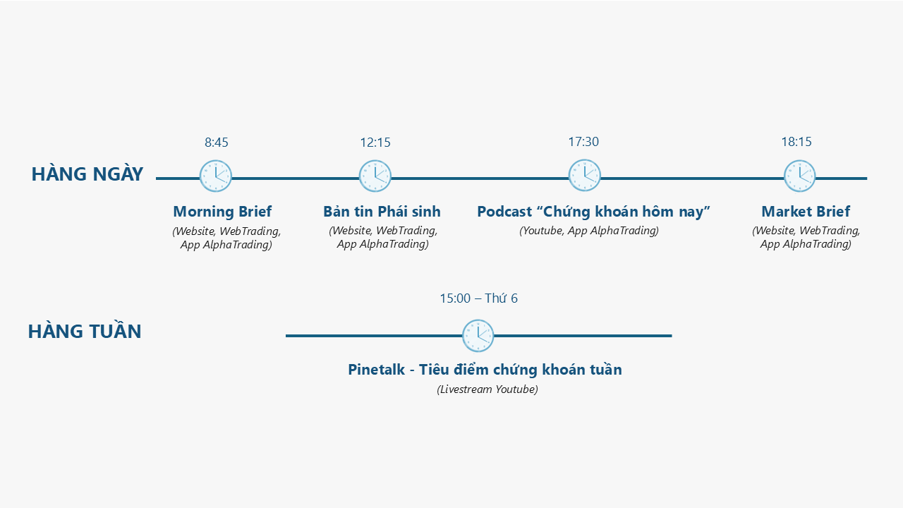 Riêng mảng chứng khoán phái sinh, Pinetree xây dựng một bản tin chuyên biệt phát lúc 12 giờ 15 phút hàng ngày. Nội dung mang tính thời sự, kịp thời cập nhật tình hình giao dịch phiên sáng và dự báo xu hướng cho phiên chiều, hỗ trợ nhà đầu tư nhanh chóng nắm bắt cơ hội trong ngày.