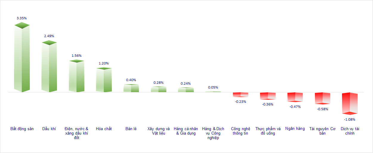 VN-Index tiếp tục lập đỉnh mới trong tình trạng xanh vỏ đỏ lòng khi dòng tiền tìm đến các cổ phiếu họ nhà Vingoup. Bất động sản, Dầu khí và Hóa chất là các nhóm có diễn biến tích cực nhất trong phiên hôm nay. Trái lại, nhóm Chứng khoán và Tài nguyên cơ bản lại có diễn biến kém khả quan.