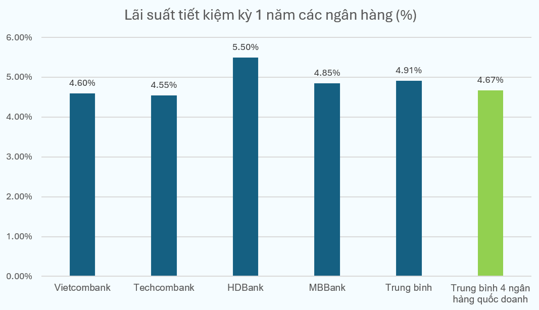 Nhìn vào mặt bằng lãi suất gửi tiết kiệm ngân hàng hiện tại, nhà đầu tư có thể thu được mức lợi tức trung bình 4.6%/năm đối với nhóm ngân hàng quốc doanh hoặc trung bình 4.9%/năm đối với toàn hệ thống. Đối với nhóm ngân hàng thương mại cổ phần cỡ nhỏ, lãi suất có thể cao hơn một chút, đạt mức hơn 5%.