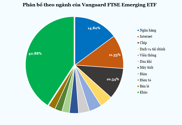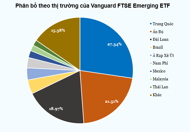 Tỷ trọng lớn nhất trong danh mục của FTSE ETF Emerging là là (TSMC ~7,1%), Tencent (4.1%), Alibaba (2.8%), HDFC Bank (1,4%), Xiaomi (1,2%), ICICI Bank (0,98%, Ngân hàng xây dựng Trung Quốc (0,85%).