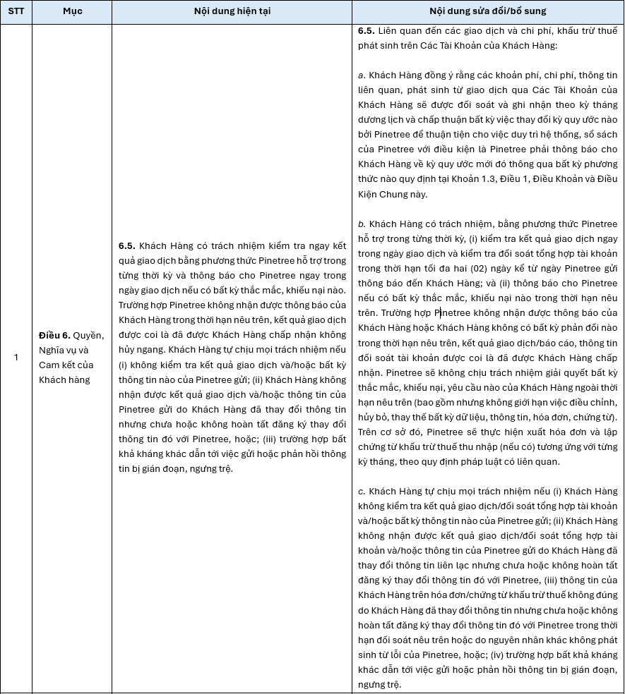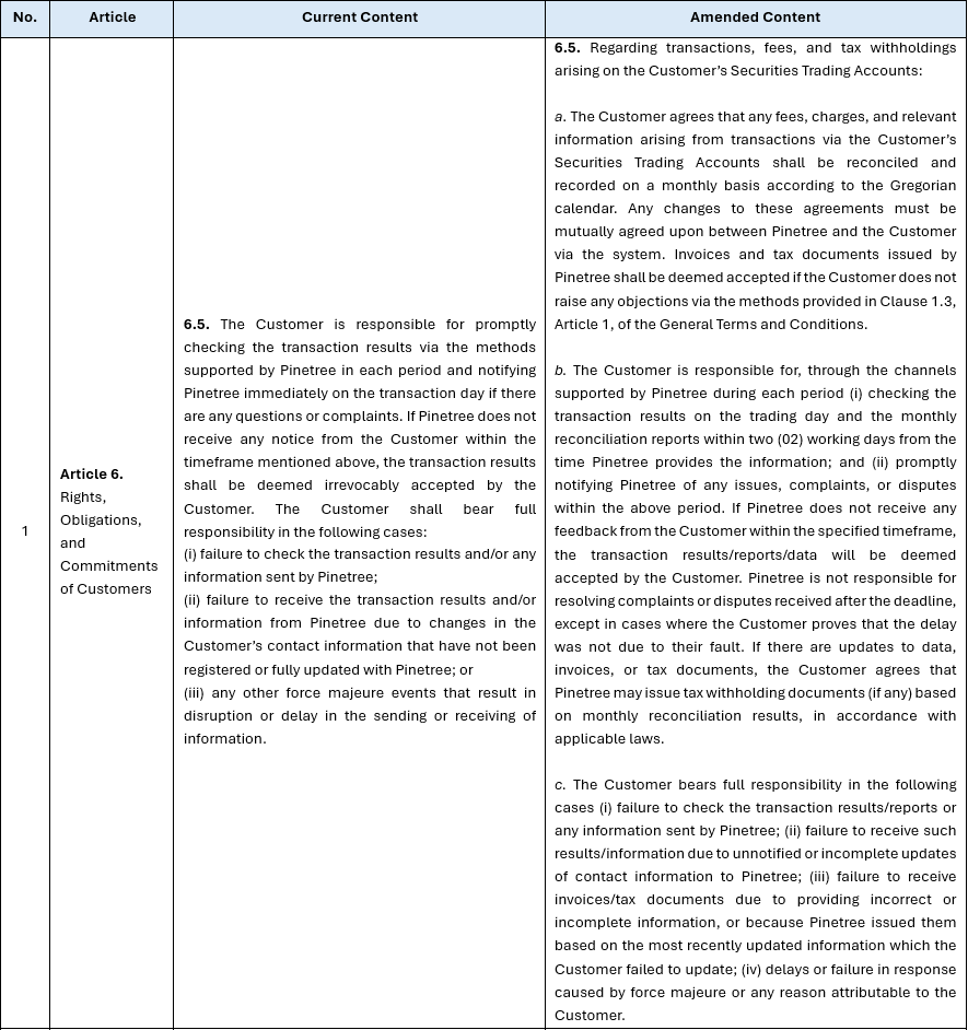 Công ty Cổ phần Chứng khoán Pinetree (“Pinetree”) xin thông báo về việc sửa đổi mẫu Hợp đồng Mở tài khoản giao dịch chứng khoán (“Hợp đồng MTK”) như sau: