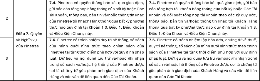Việc sử dụng dịch vụ sau ngày mà các sửa đổi này có hiệu lực sẽ được xem là sự chấp nhận hoàn toàn của Quý khách đối với các sửa đổi đó. Nếu Quý khách không đồng ý với việc sửa đổi điều khoản nêu trên, Quý khách có quyền yêu cầu chấm dứt Hợp đồng GDCK bằng việc gửi Giấy đề nghị đóng tài khoản cho Pinetree.