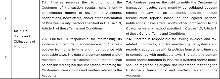 The continued use of the service after the effective date of these amendments shall be deemed as your full acceptance of such amendments. If you do not agree with the amended terms, you have the right to request termination of the Securities Trading Contract by submitting a written request for account closure to Pinetree.