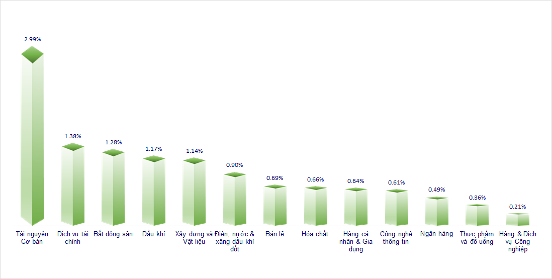 VN-Index tiếp tục bùng nổ theo đà với dòng tiền lan tỏa tới nhiều nhóm ngành. Đáng chú ý, Tài nguyên và Chứng khoán là các nhóm ngành có diễn biến tích cực nhất trong phiên hôm nay. Trái ngược lại, Viễn thông và Bảo hiểm lại có diễn biến kém khả quan.
