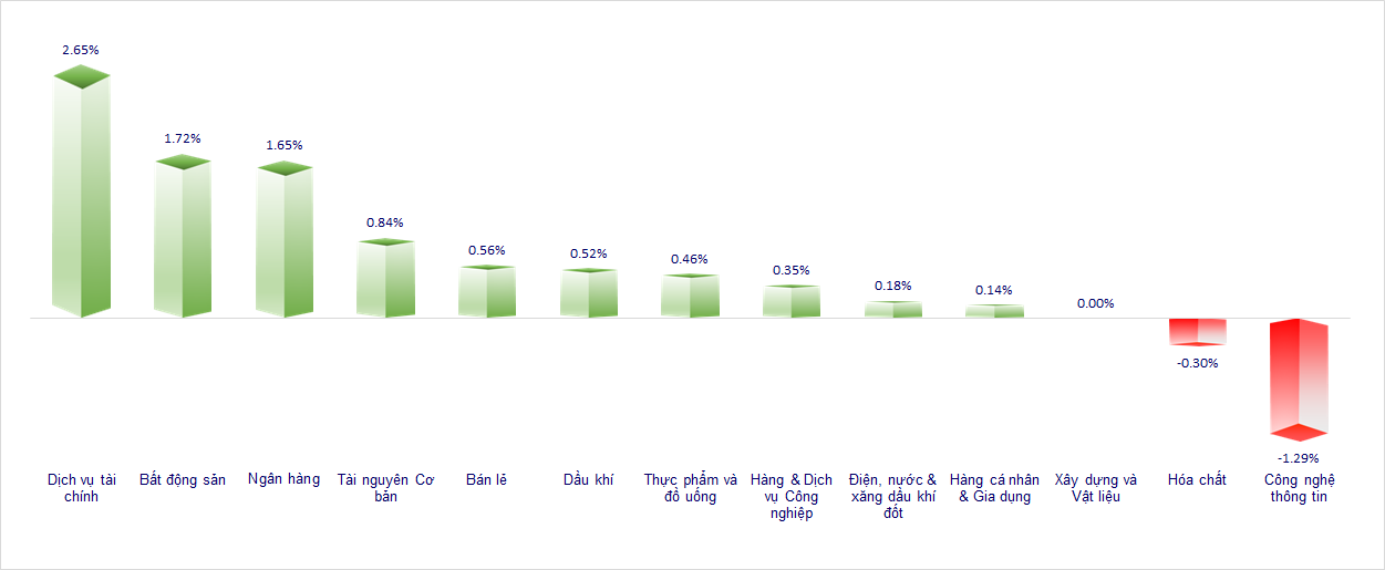 VN-Index tiếp tục bùng nổ mạnh mẽ với thanh khoản giao dịch đạt kỷ lục trong vòng 2 tháng - tổng giá trị lên tới 41 nghìn tỷ đồng. Đáng chú ý, Chứng khoán và Bất động sản tiếp tục là các nhóm ngành có diễn biến tích cực nhất trong phiên hôm nay. Trái ngược lại, Công nghệ và Hóa chất lại có diễn biến kém khả quan.