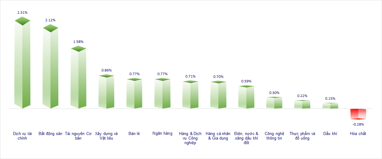 Dòng cổ phiếu BĐS tiếp tục thu hút dòng tiền khi nhà đầu tư kỳ vọng vào các cổ phiếu nhóm này sẽ làm nên chuyện trong thời gian tới. Cụ thể, PDR và DIG đều +3.3%, HDG +2.7%, DXG +2.4%,… Đặc biệt, cổ phiếu LDG đánh dấu 9 phiên tăng trần liêp tiếp và ghi nhận hiệu suất bùng nổ khi x3 lần giá cổ phiếu chỉ trong vòng 1 tháng.