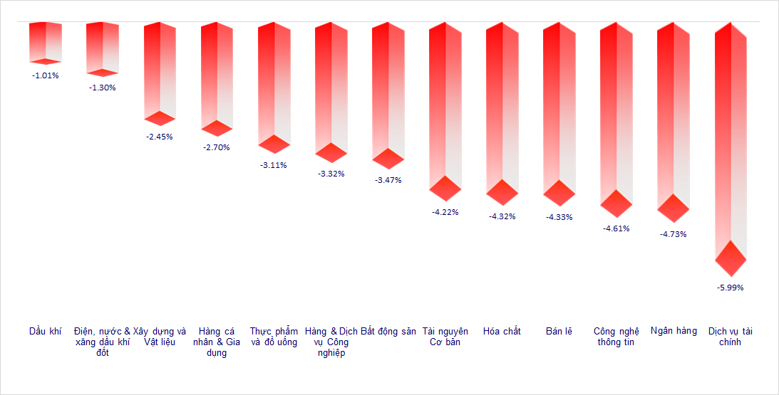 VN-Index hôm nay có phiên phân phối mạnh với thanh khoản kỷ lục vượt 80 nghìn tỷ. Hầu hết các nhóm ngành đều có diễn biến kém khả quan trong phiên hôm nay, tiêu cực nhất phải kể tới Chứng khoán, Viễn thông, Ngân hàng và Bán lẻ.