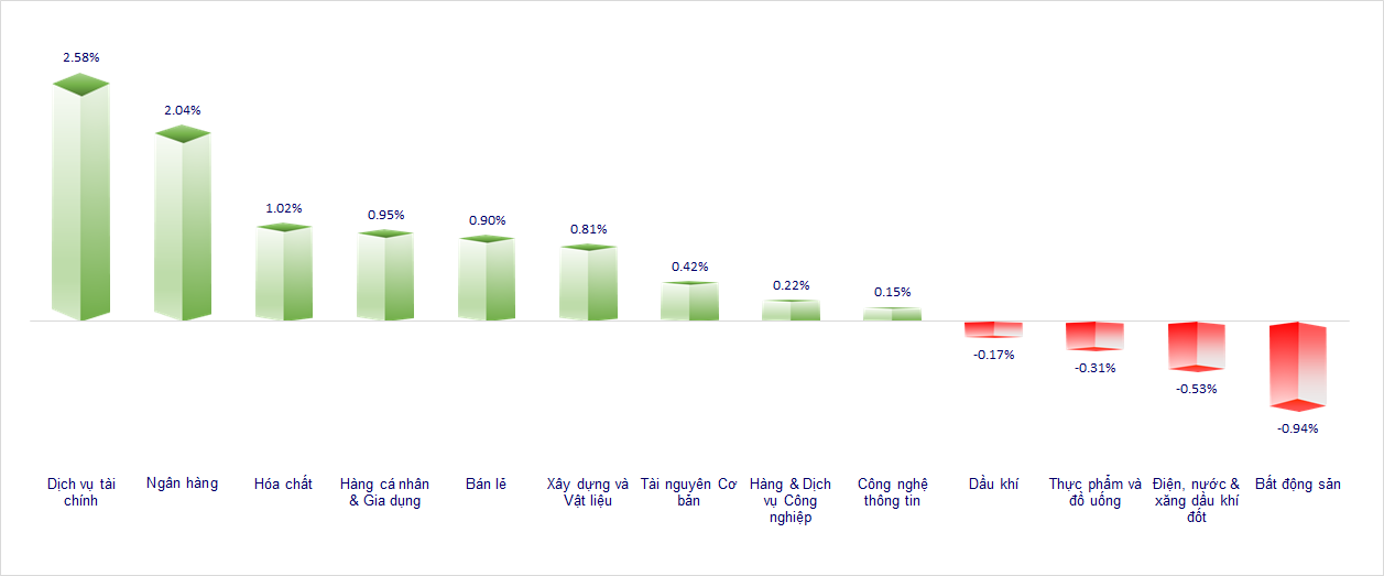 VN-Index hôm nay hồi phục trở lại với thanh khoản đạt gần 1.8 tỷ đô. Chứng khoán, Ngân hàng và Hóa chất là các nhóm ngành tích cực đáng chú ý trong phiên hôm nay. Trái lại, Bất động sản và F&B lại có diễn biến không mấy khả quan.