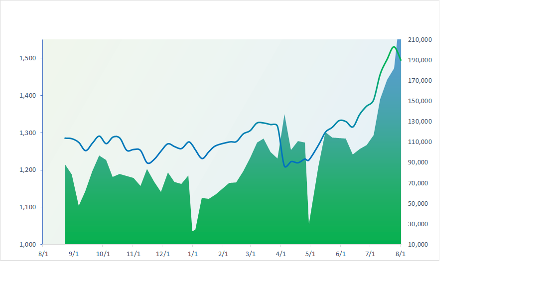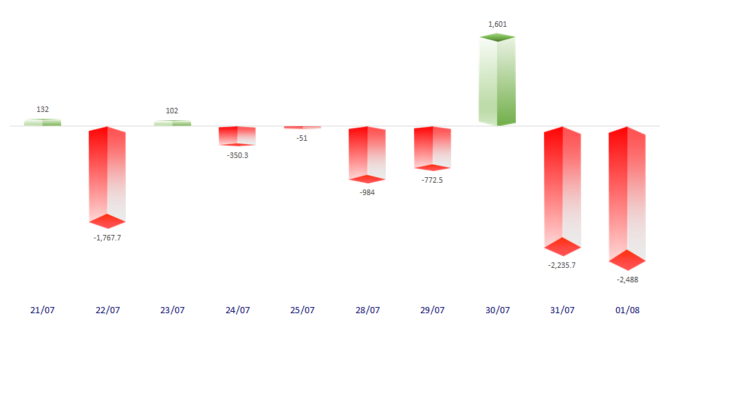 Thị trường khởi đầu phiên khá tích cực với nhiều thông tin hỗ trợ như việc nâng chỉ tiêu tăng trưởng tín dụng của NHNN, PMI tháng 7 đạt 52.4 điểm, tăng mạnh so với tháng 6 và là lần đầu tiên vượt mốc 50 điểm sau 4 tháng. Bên cạnh đó, Hoa Kỳ đã chính thức công bố mức thuế đối ứng với các quốc gia trên thế giới, về cơ bản phù hợp với kỳ vọng của các nhà đầu tư. Các nhóm ngành như Ngân hàng và Chứng khoán khởi đầu khá hưng phấn, tuy nhiên, sự đảo chiều đã sớm xảy ra sau 10h sáng khi áp lực bán mạnh mẽ từ phía khối ngoại xuất hiện từ rất sớm. VN-Index giảm liền hơn 20 điểm và phải tới sau 14h chiều mời bắt đầu có sự phục hồi.