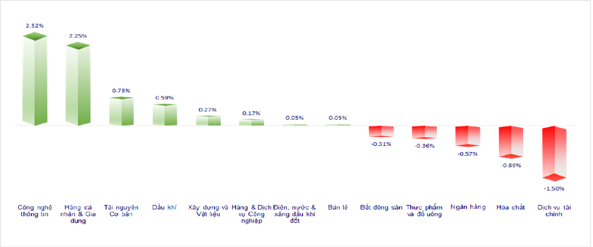 Hóa chất, Thép và Thủy sản đều có phiên giảm điểm với NKG-4%, ANV-2.4%, VHC-1.6%, LAS-2% và DGC-1.3%. Đây là phiên giao dịch cuối cùng trước khi DGC được thêm vào rỏ VN30.