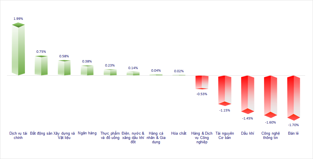 VN-Index kết phiên trong sắc xanh dù trong phiên có thời điểm giảm hơn 22 điểm. Bảo hiểm, Chứng khoán và Viễn thông là các nhóm có diễn biến tích cực đáng chú ý ngày hôm nay. Trái lại, nhóm Dầu khí, Bán lẻ và Công nghệ lại có diễn biến khá ảm đạm.