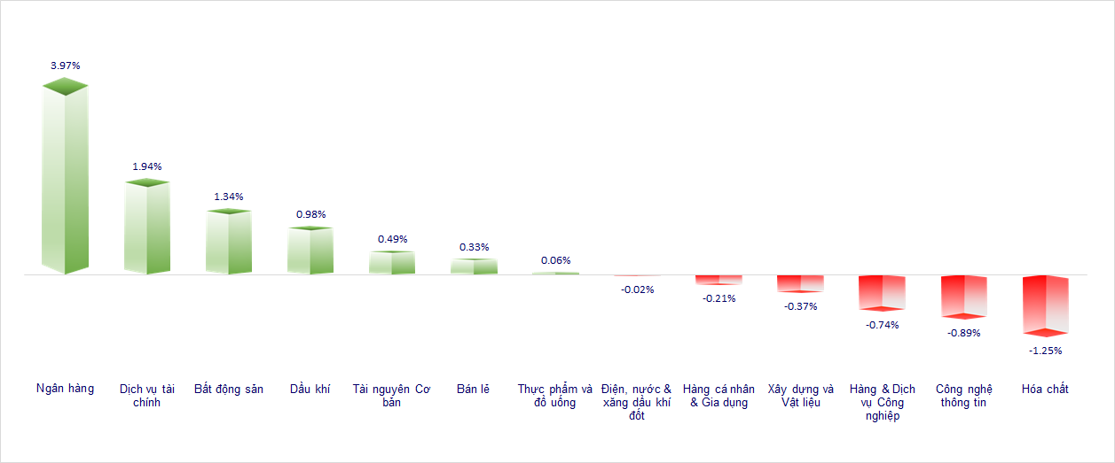 VN-Index hôm nay đóng cửa gần cao nhất phiên với mức tăng ấn tượng gần 30 điểm. Ngân hàng, Chứng khoán và Bất động sản là các nhóm có diễn biến tích cực đáng chú ý ngày hôm nay. Trái lại, nhóm Hóa chất, Công nghệ và Xây dựng lại có diễn biến khá ảm đạm.