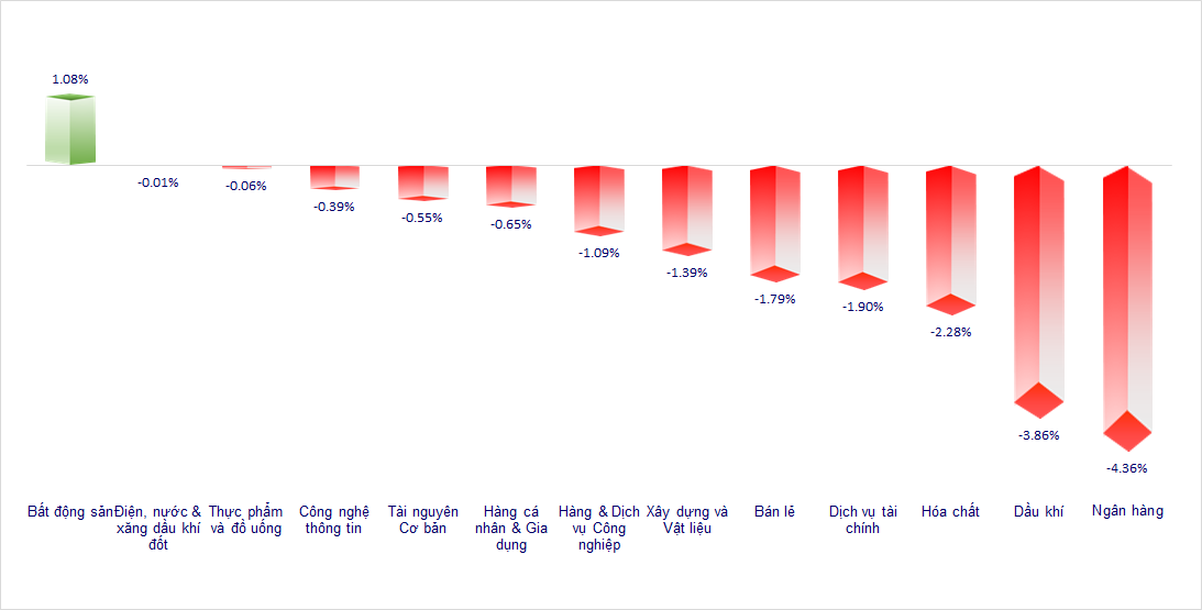 VN-Index có phiên điều chỉnh mạnh thứ 2 dưới áp lực từ ngành Ngân hàng khi nhiều cổ phiếu trong nhóm này giảm sàn. Hầu hết các nhóm ngành hôm nay đều giảm điểm, chỉ trừ họ nhà Vingroup và nhóm Bảo hiểm có diễn biến khá tích cực.