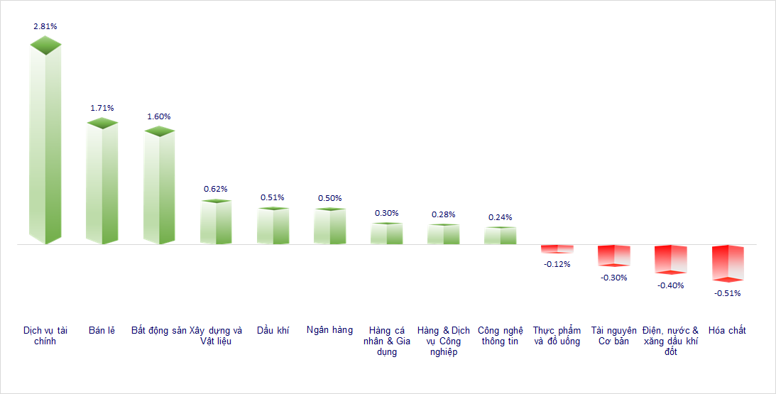 VN-Index bất ngờ được kéo phục hồi cuối phiên chiều với sự bùng nổ của nhóm Chứng khoán và Bất động sản. Hầu hết các nhóm ngành đều đảo chiều tăng điểm tại phiên hôm nay với sự tích cực nhất đến từ nhóm Chứng khoán, Bất động sản và Bán lẻ. Trái lại, nhóm Hóa chất và Tài nguyên lại có diễn biến không mấy khả quan.
