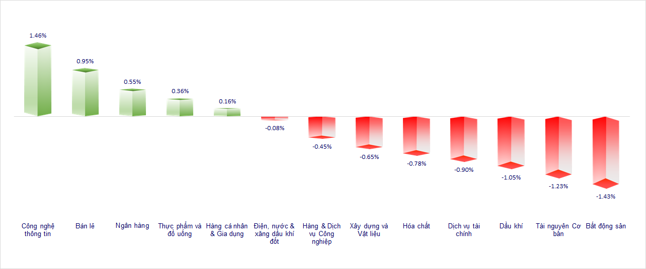 VN-Index giảm mạnh trong phiên chiều mặc dù mở cửa với gap tăng hơn 10 điểm. Công nghệ, Bán lẻ và Ngân hàng các nhóm ngành tăng điểm trong phiên hôm nay. Trái lại, Bất động sản, Tài nguyên và Dầu khí lại có diễn biến khá ảm đạm.