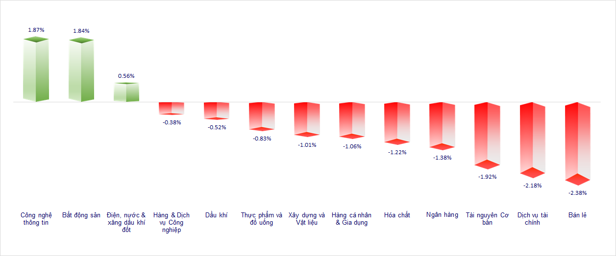 Một số cổ phiếu giảm điểm đáng chú ý khác như Khu công nghiệp (KBC -3.7%, IJC -3.5%, SIP -2.5%), họ GELEX (VIX -3.9%, VSC -3.3%, EIB -2.5%, VGC -2.4%, BSR -1.3%), Hóa Chất (CSM -2.4%, DPM -2.2%, PHR và GVR đều -1.9%), HVN -2.1%, PVD -1.5%, …