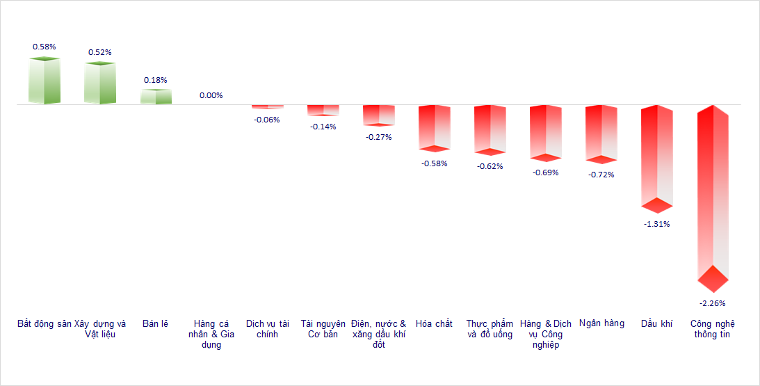 VN-Index vẫn giữ vững mốc MA20 ngày bất chấp kết phiên giảm hơn 15 điểm. Bất động sản và Bán lẻ là các nhóm có diễn biến tích cực nhất trong phiên hôm nay. Trái lại, nhóm Công nghệ, Dầu khí và Ngân hàng lại diễn biến khá ảm đạm.