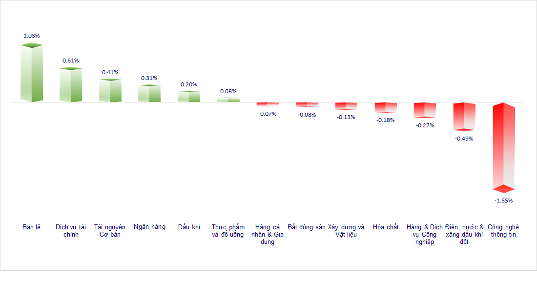 VNIndex biến động sideway trong biên độ 10 điểm kèm thanh khoản cạn kiệt. Đa số các nhóm ngành đều ảm đạm trong phiên hôm nay, trong khi đó một vài cổ phiếu ngân hàng tăng điểm giúp cho VNIndex không bị điều chỉnh sâu.