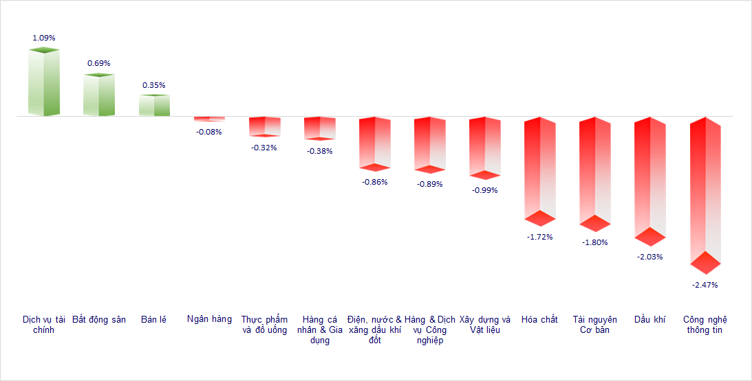 Một số nhóm cổ phiếu giảm điểm đáng chú ý khác có thể kể tới như nhóm Ngân hàng (OCB-1.2%, VCB-1% và BID-0.7%), Chứng khoán (FTS-0.8%, CTS-0.5%) và Bán lẻ (MSN-1%, FRT-0.7% và SAB-0.7%).