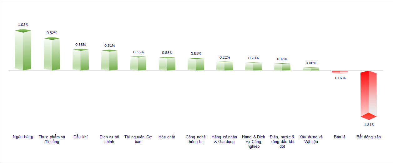 VN-Index chủ yếu giao dịch trong sắc xanh trong phiên hôm nay nhờ sự trở lại của nhóm cổ phiếu Ngân hàng. Ngân hàng, Dầu khí và Chứng khoán là các nhóm có diễn biến tích cực nhất trong phiên hôm nay. Trái lại, Bất động sản và Bán lẻ lại có diễn biến khá tiêu cực.