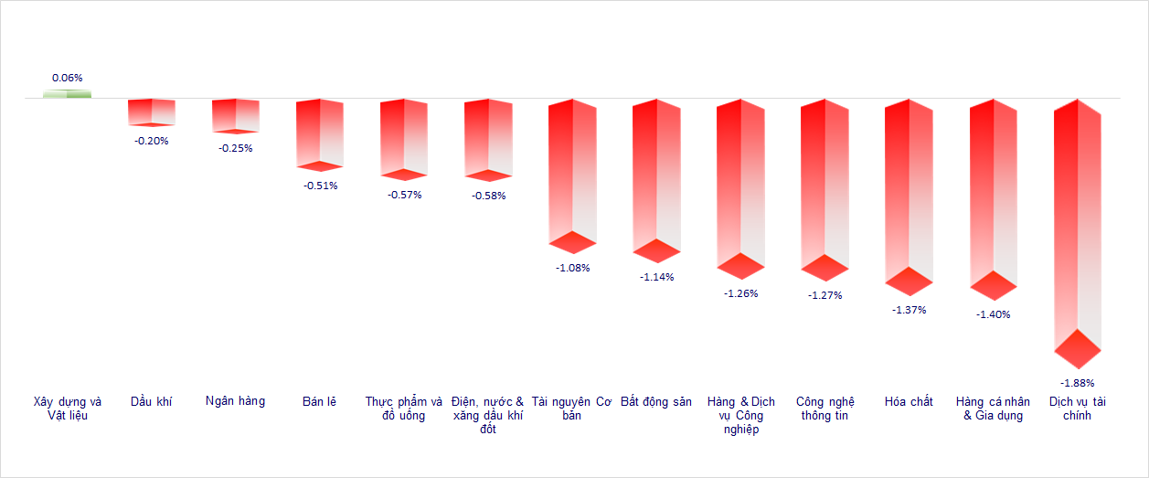 Một số nhóm cổ phiếu giảm điểm đáng chú ý khác có thể kể tới như Bảo hiểm (BVH -1.5%, PVI -1.7%), Dầu khí (PVS -0.9%, PVD -1.4%), Điện (POW -1.4%, REE -0.9%), Đầu tư công (CII -4.8%, HHV -4.3%, LCG -4%, PC1 -2.9%, KSB -2%), Khu công nghiệp (KBC và IJC đều -3.7%, SZC -1.4%, VGC -2.1%), HUT -3.4%, YEG -2.4%, EVF -3.2%,…