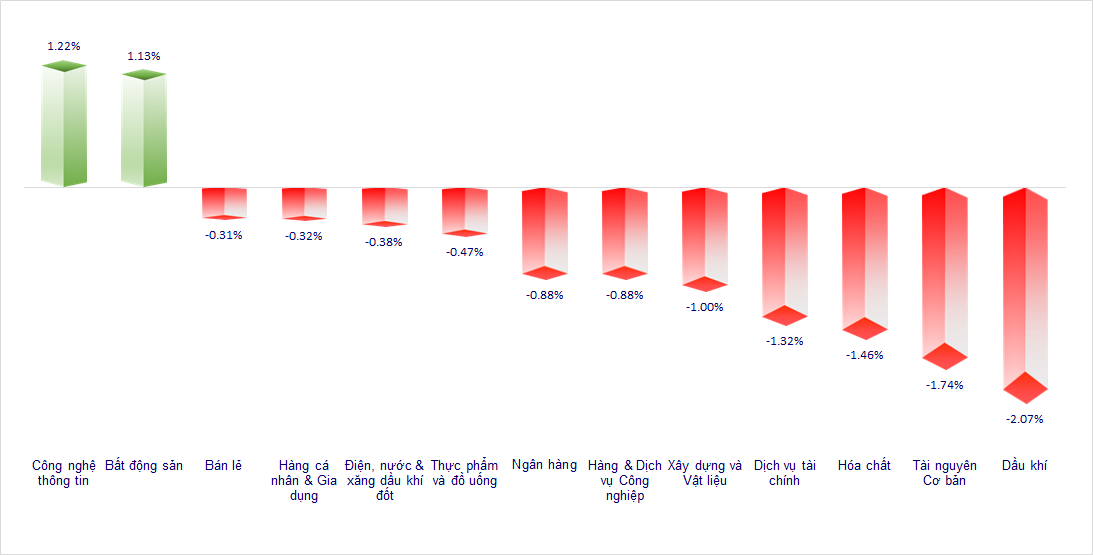 VN-Index rút chân nhẹ trong phiên nhờ sự hỗ trợ từ nhóm cổ phiếu nhà Vingroup. Họ cổ phiếu Vingroup và Công nghệ là hai nhóm cổ phiếu có diễn biễn tích cực trong phiên hôm nay. Trái lại, nhiều nhóm cổ phiếu điều chỉnh tiêu cực trong phiên với sự nổi bật đến từ nhóm Dầu khí, Tài nguyên và Hóa chất.