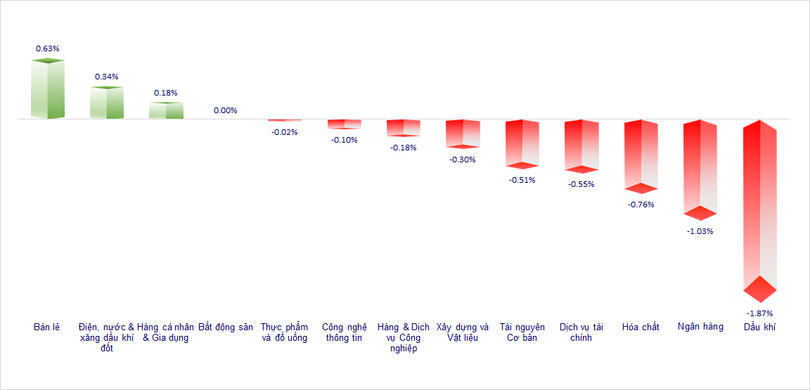 VN-Index quay đầu điều chỉnh trước thềm thời khắc lịch sử của thị trường chứng khoán Việt Nam. Hầu hết tất cả nhóm ngành đều giảm điểm trong phiên hôm nay. Tiêu cực nhất là nhóm Dầu khí, Ngân hàng và Hóa chất. Trái lại, Họ nhà Vingroup và Bán lẻ là các nhóm cổ phiếu có diễn biến tích cực trong phiên.